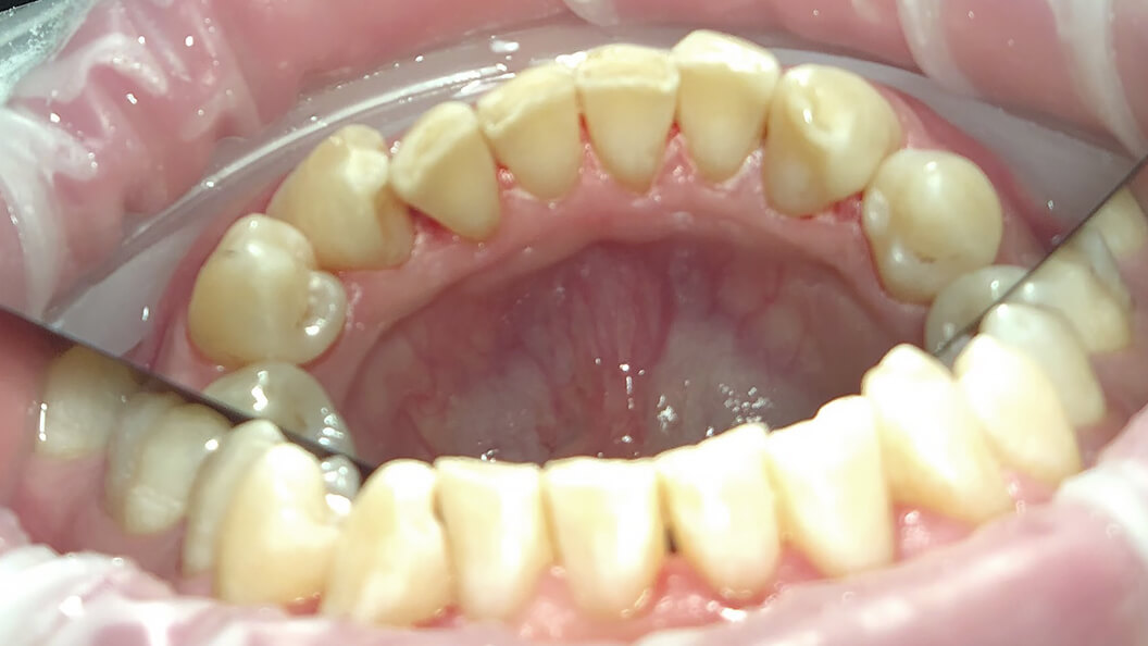 Зубы поочередно обрабатываются струей воды с чистящим порошком. Остатки средства удаляют из полости рта стоматологическим пылесосом.