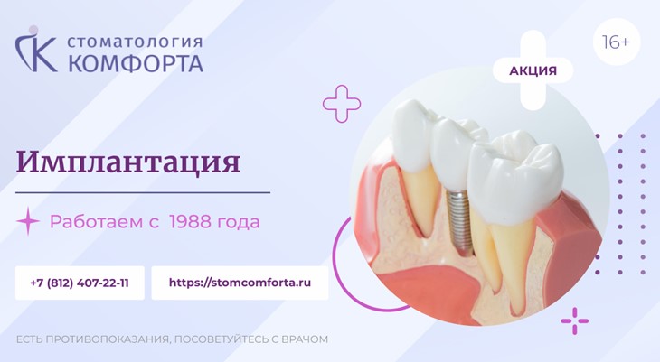 В «Стоматологии Комфорта» мы уверены в результате и даём на импланты пожизненную гарантию. Наши высококвалифицированные врачи с опытом работы более 35 лет добиваются приживаемости в 99,7 % случаев!