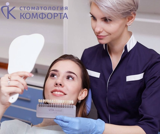 Отбеливание зубов для достижения оптимального результата рекомендуется проводить профессионально в стоматологической клинике. В «Стоматологии Комфорта» мы гарантируем безупречную улыбку, о которой вы мечтали, всего за один часовой визит в клинику. После процедуры зубы станут светлее на 8-10 тонов.
