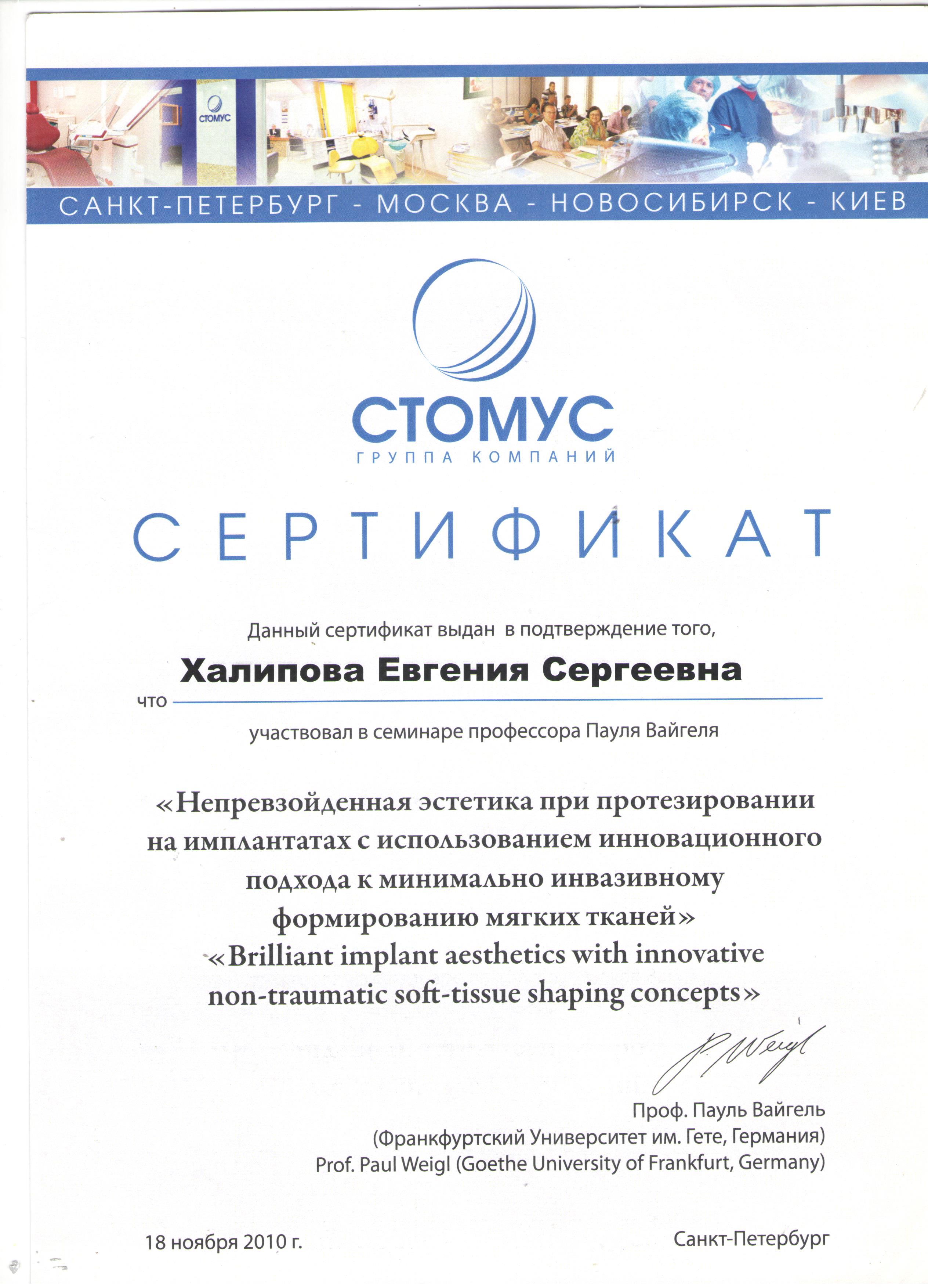 Более пяти лет периодически получаю стоматологическую помощь в клинике "Стоматология Комфорта" (Гороховая ул., д.25) и персонально у доктора Халиповой Евгении Сергеевны. Евгения Сергеевна не только высококлассный специалист и настоящий мастер своего дела с "золотыми" руками, но и чуткий к просьбам пациентов и отзывчивый врач. Лечиться у Евгении Сергеевны комфортно, надежно и доступно. Также, важно и то, что в ходе непосредственного лечения Евгения Сергеевна очень тактично и умело руководит своими помощниками. Спасибо Вам Евгения Сергеевна за наше здоровье и открытые улыбки.