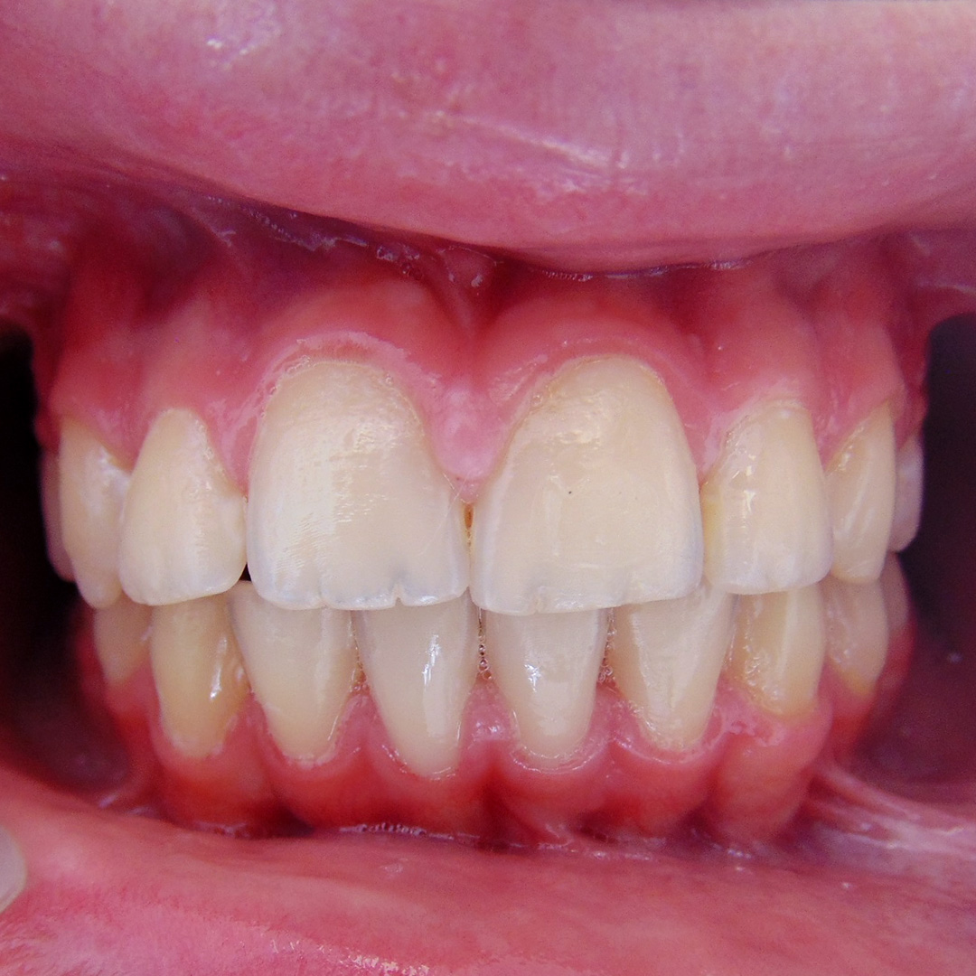 В «Стоматологию Комфорта» обратилась пациентка с целью исправления прикуса. В ходе осмотра врач-ортодонт Резниченко Анна Васильевна поставила диагноз: вертикальная резцовая окклюзия и индивидуальная макродентия. Было принято решение о лечении брекет-системой Damon Q2 (ORMKO).