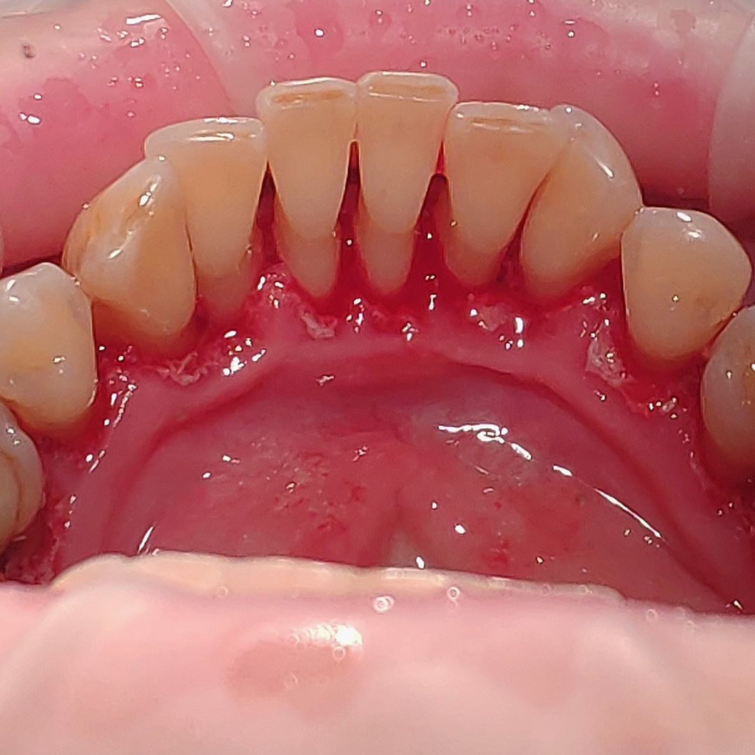 В «Стоматологию Комфорта» обратился пациент с жалобой на наличие зубных камней и кровоточивость дёсен во время чистки зубов. При осмотре врач обнаружил твёрдый и пигментированный налёт, выявил хронический генерализованный катаральный гингивит. Пациенту назначена профессиональная гигиена полости рта для удаления наддесневых и поддесневых отложений, полировка зубов и медикаментозная обработка дёсен.