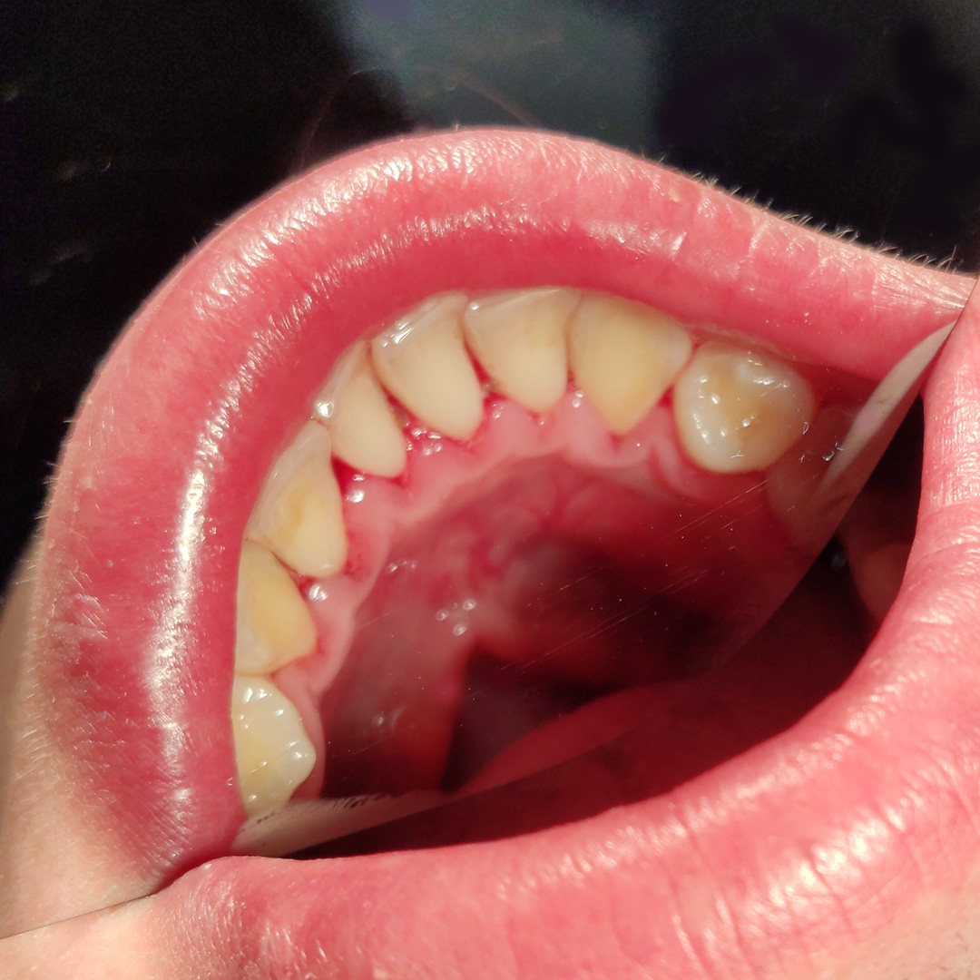 На момент осмотра были обнаружены наддесневые зубные отложения, десна отёчна и кровоточила при зондировании. Нашим специалистом Григорьевым Петром Игоревичем была назначена профессиональная гигиена полости рта