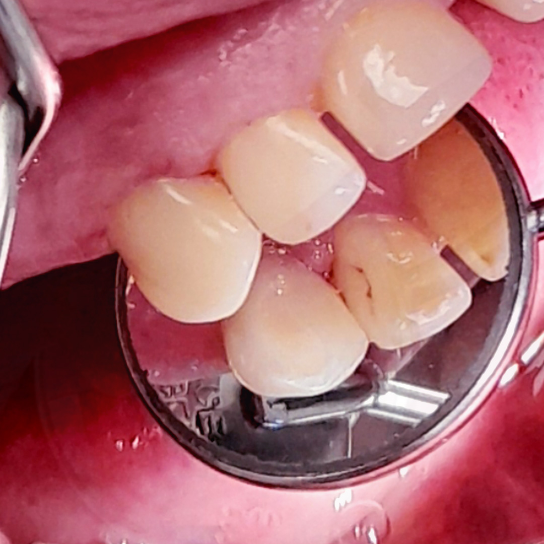 Пациентка обратилась с жалобами на выпадение пломбы из 13 зуба и длительную боль от температурных раздражителей, ранее были отмечены периодические боли ноющего характера в области 13 зуба. При осмотре врачом-стоматологом-терапевтом Похилько Н. Г. была выявлена глубокая кариозная полость, зондирование которой было резко болезненным в одной точке. Перкуссия была безболезненной. Также при обработке полости под контролем кариес-маркера Похилько Н. Г. выявила сообщение с полостью зуба. Врач поставил диагноз: хронический фиброзный пульпит 13 зуба. Было принято решение о лечении пульпита в 2 посещения с последующей постановкой постоянной композитной пломбы и направлением пациента к ортопеду для покрытия зуба коронкой.