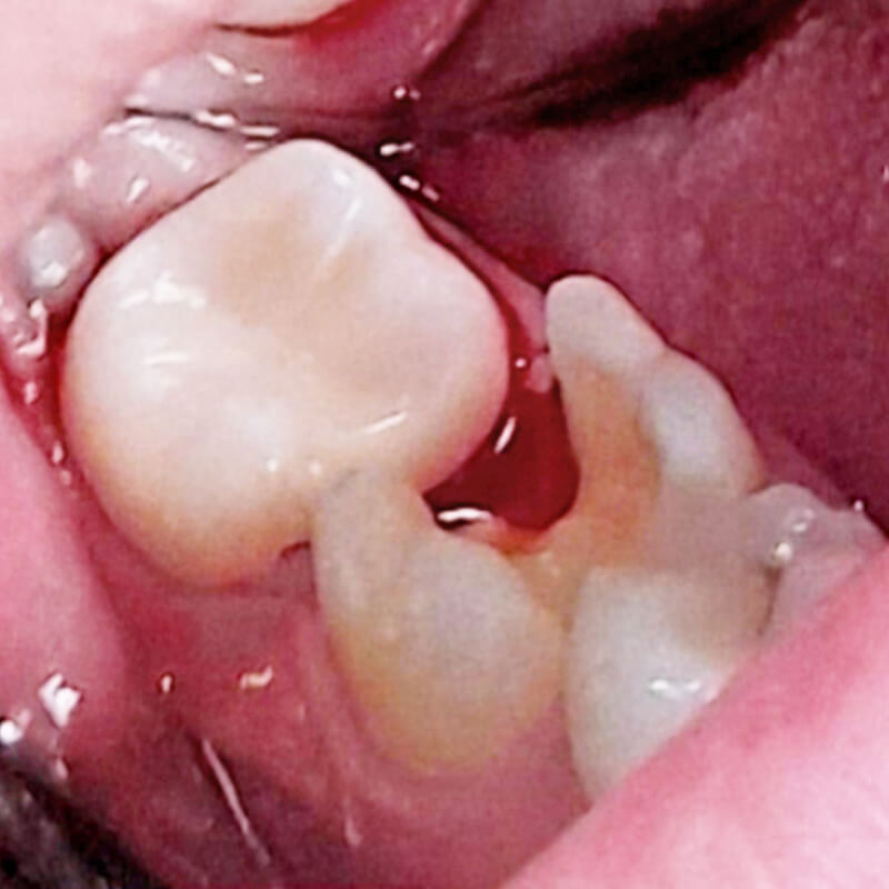 Пациентка обратилась в «Стоматологию Комфорта» с жалобами на наличие полостей в области боковых зубов нижней челюсти с правой стороны, а также на застревание пищи и кратковременную боль от холодного. Врач стоматолог-терапевт Похилько Надежда Геннадьевна выявила кариозные полости на 47 и 46 зубах во время осмотра. Реакция на зондирование была болезненной. Врач проанализировала КТ и обнаружила наличие сообщения кариозной полости 47 зуба и полости в 46 зубе. Дальнейшее препарирование под контролем кариес-маркера позволило диагностировать хронический фиброзный пульпит 46 зуба и хронический глубокий кариес 47 зуба. Было решено провести лечение с помощью материала Estelite. Врач также рекомендовала эндодонтическое лечение 46 зуба, которое было осуществлено в следующее посещение. После этого пациент был направлен к ортопеду. На фото — 47 зуб после полного лечения и 46 — после препарирования.