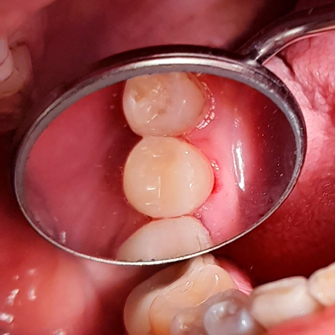 В «Стоматологию Комфорта» обратился пациент с жалобами на выпадение пломбы из 45 зуба и кратковременные боли от приёма холодных продуктов. Врач-стоматолог-терапевт Похилько Н. Г. в ходе осмотра выявила кариозную полость на мезиально-окклюзионно-дистальной поверхностях 45 зуба. Зондирование было болезненно, перкуссия — безболезненна. Был поставлен диагноз: хронический глубокий кариес 45 зуба. Врач пришёл к выводу о лечении с последующей установкой пломбы из светоотверждаемого композита Estelite.