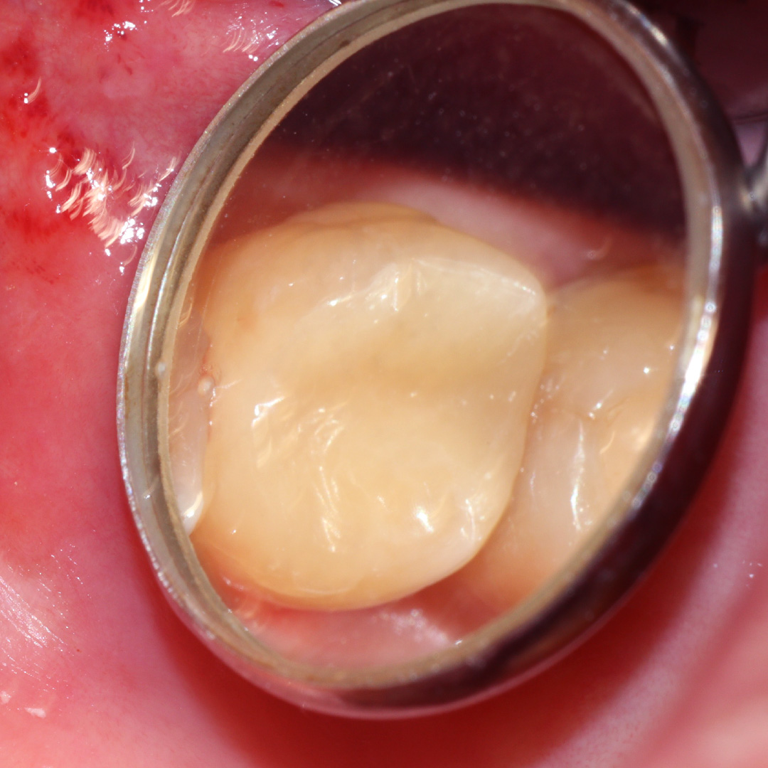 В клинику «Стоматология Комфорта» обратился пациент с жалобой на выпадение пломбы из моляра верхней челюсти, а также на чувствительность зуба к перепадам температуры и застревание кусочков пищи. В результате осмотра выявлен хронический глубокий кариес зуба 27. Проведено лечение с применением светоотверждаемого композита Эстелайт.
