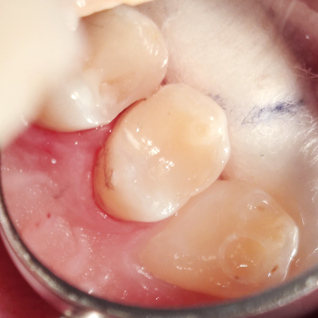 Пациент обратился с жалобами на эстетический недостаток в области правого верхнего зуба. После обработки полости под контролем кариес-маркера была обнаружена полость средней глубины. Дно и стенки плотные, гладкие, блестящие, при зондировании крепетируют. Реакция не перкуссию и холодную пробу безболезненная. Диагноз — хронический средний кариес.