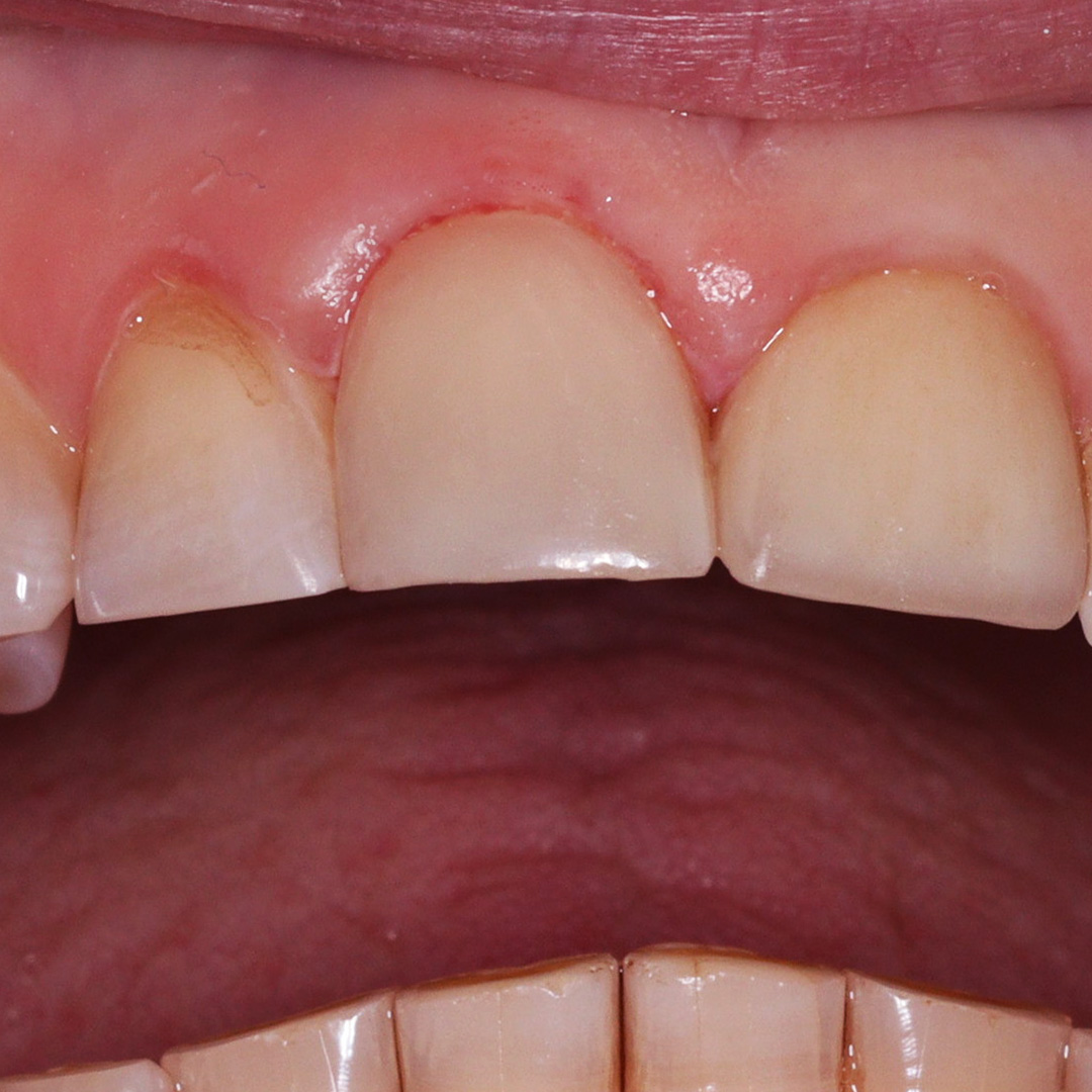 В «Стоматологию Комфорта» обратилась пациентка с жалобой на неудовлетворительную эстетику зуба 1.1 — резца верхней челюсти. Стоматолог-терапевт Прудникова Инна Владимировна в ходе осмотра челюсти пациента установила наличие дисплазии эмали. Рекомендована реставрация зуба светоотверждаемым композитом.