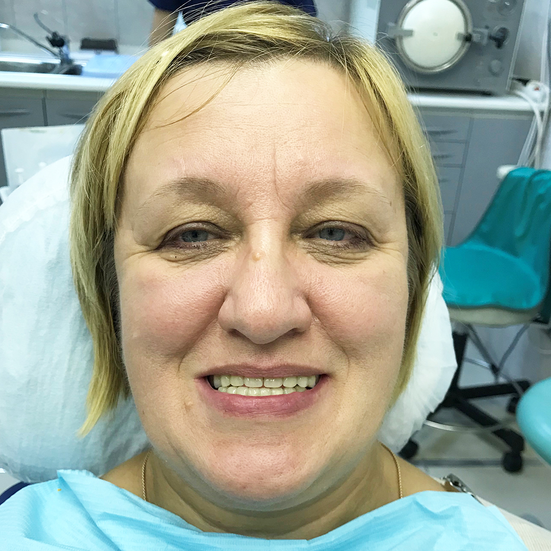 Пациентка обратилась в «Стоматологию Комфорта» с жалобой на отсутствие зубов верхней челюсти. По результатам обследования врач стоматолог-ортопед, хирург-имплантолог Мельников Алексей Владимирович назначил имплантацию по методу «all-on-4». По истечении 6 месяцев после операции проведено обслуживание условно-съёмного протеза. Также врач начал восстановление нижней челюсти коронками в комбинации с бюгельный протезом.