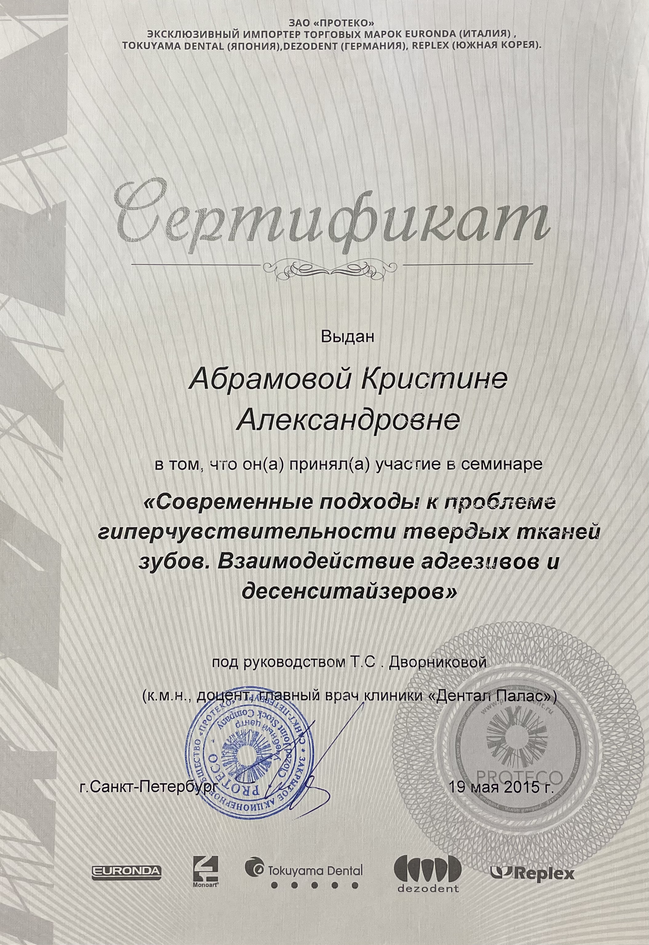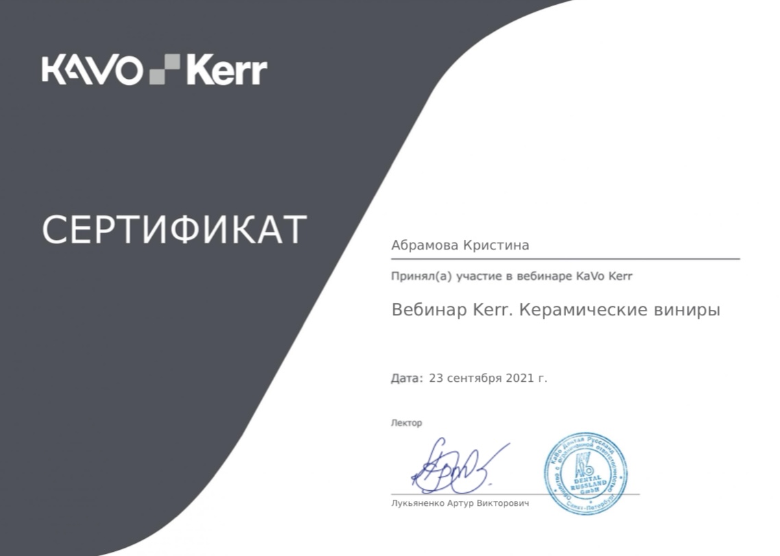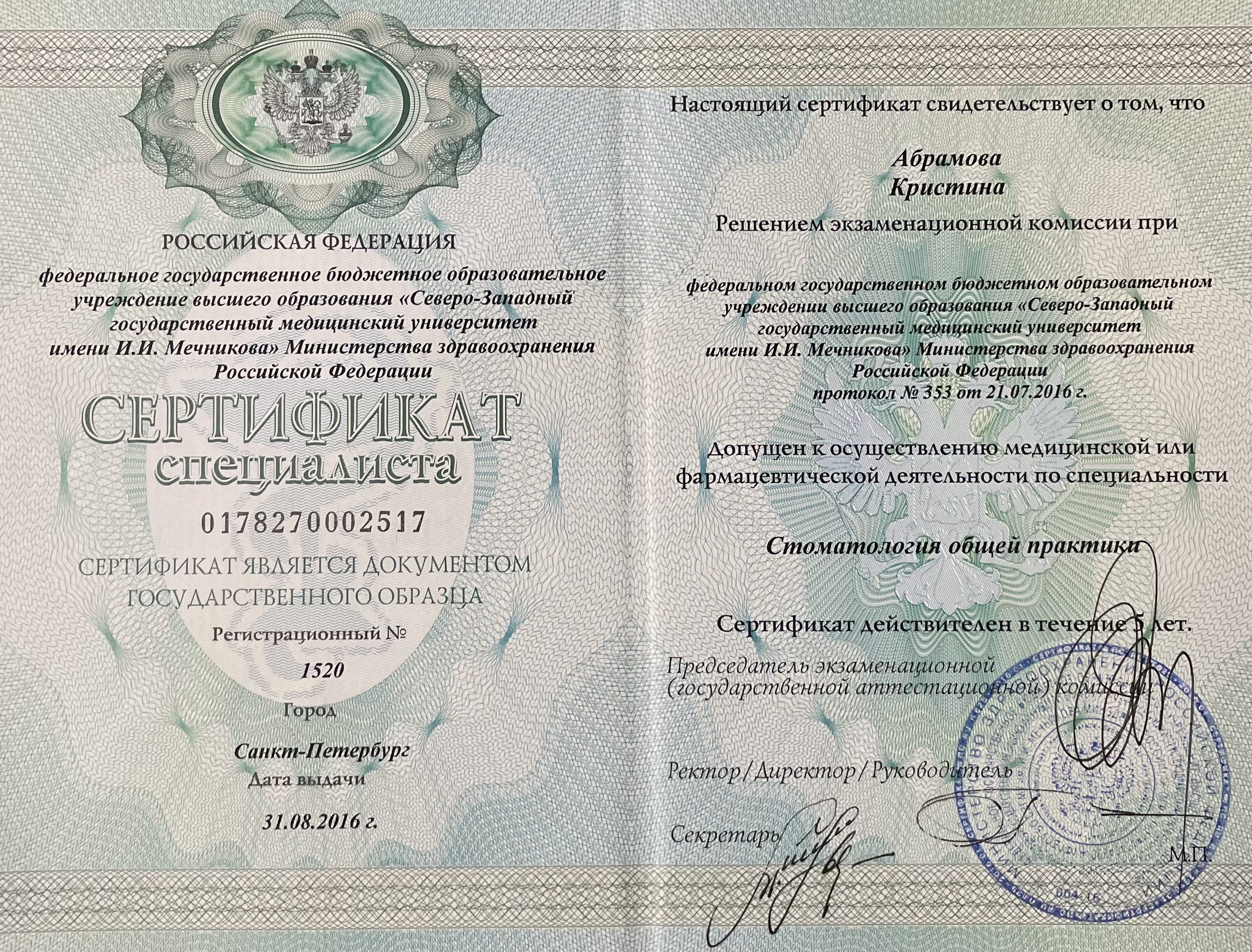 Абрамова Кристина Александровна в 2015 году окончила Первый Санкт-Петербургский государственный медицинский университет им. акад. И.П. Павлова по специальности «Врач – Стоматолог».