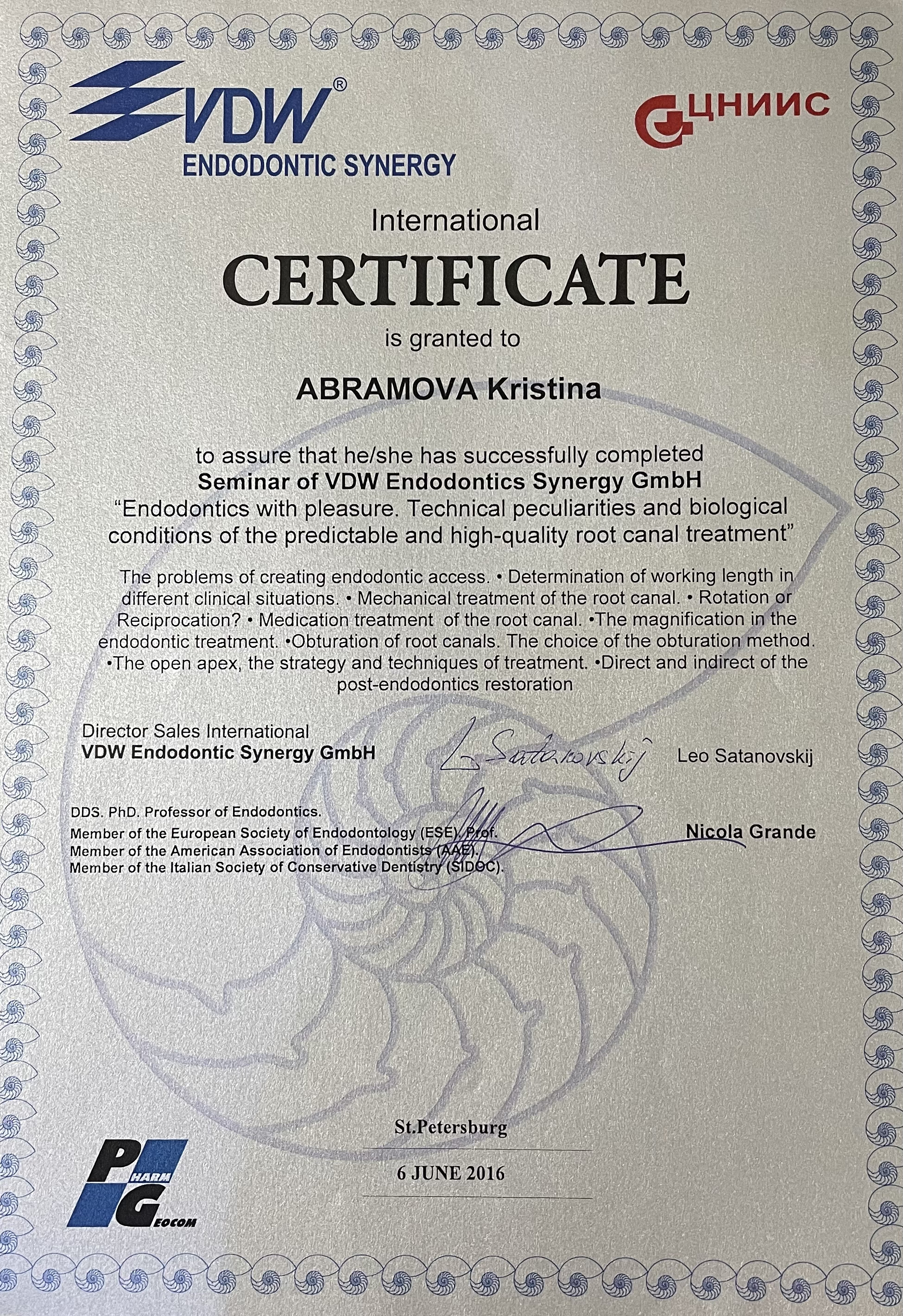 2015 – XI Международный Конгресс VDW GmbH «Революционные технологии в эндодонтическом лечении»;