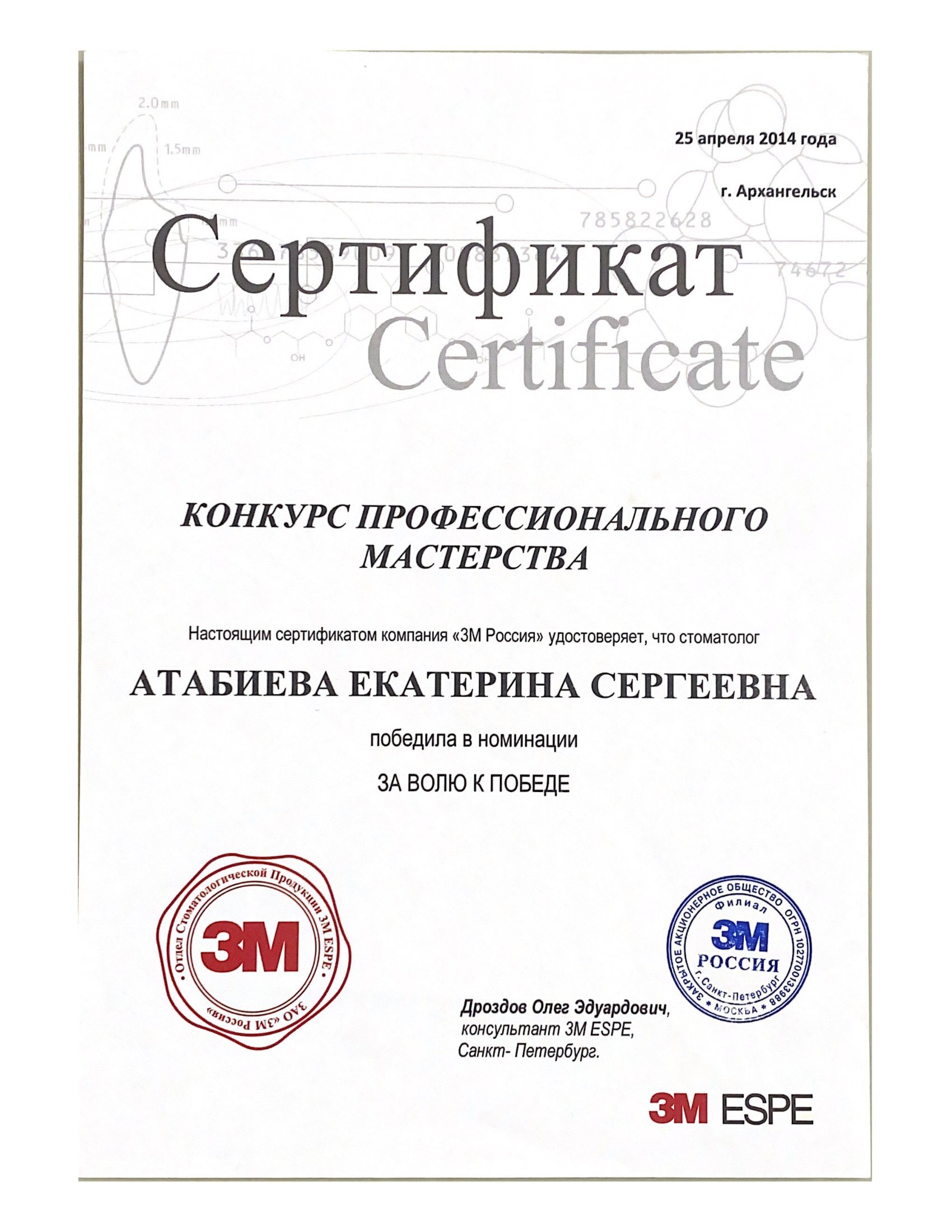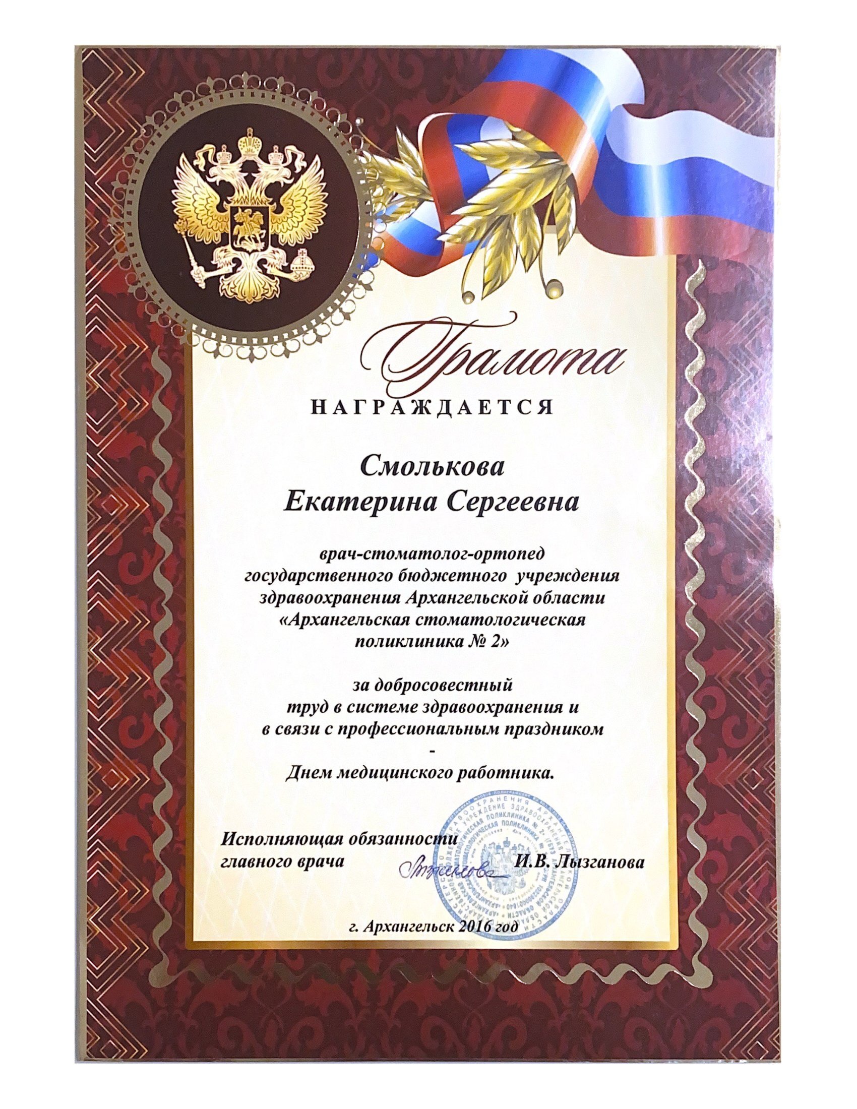 - Превосходное образование: окончила Северный Государственный Медицинский Университет, интернатуру по стоматологии общей практики и ординатуру по ортопедической стоматологии